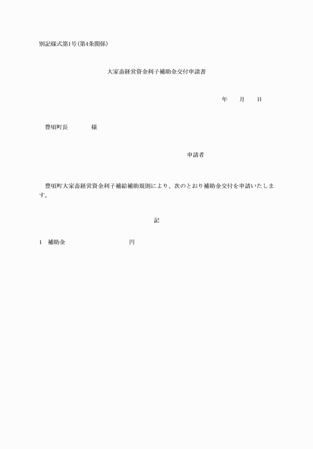 第4条 補助金の交付を受けようとする者は、次に掲げる書類を町長に提出しなければならない。ただし、豊頃町農業協同組合代表理事組合長(以下「農協組合長」という。)は、補助対象者の委任により一括申請することができるものとする。