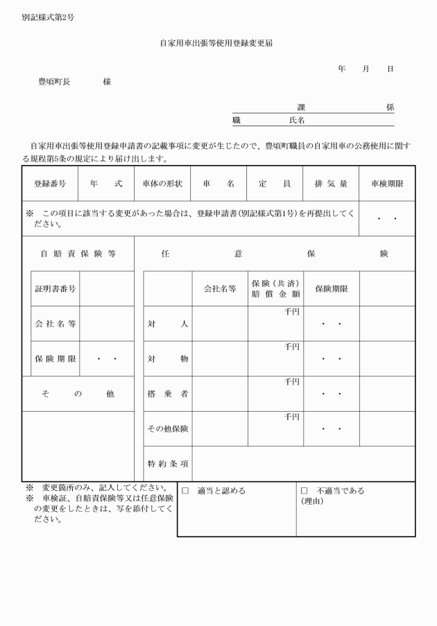 第4条 職員は、出張等のため自家用車を運転しようとするときは、あらかじめ、自家用車出張等使用登録申請書(別記様式第1号)を町長に提出し、登録を受けなければならない。