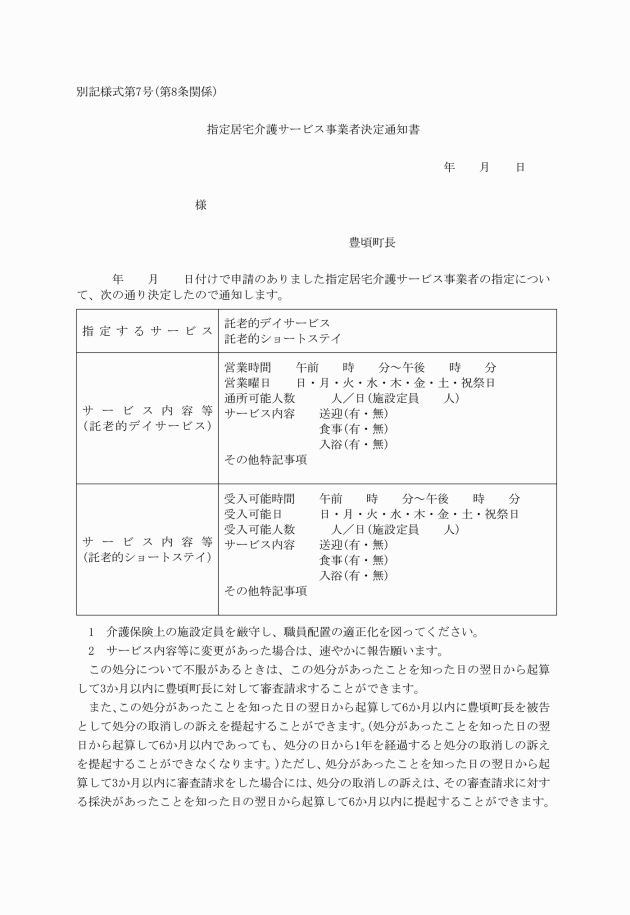 第7条 指定居宅介護サービス事業者の指定を受けようとする者は、指定居宅介護サービス事業者指定申請書(別記様式第6号)に法第41条第1項に規定する指定居宅サービス事業者申請書及び当該申請に係る指定通知書の写しを添えて、町長に申請しなければならない。