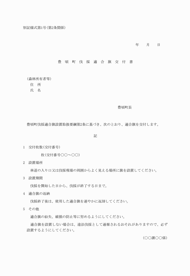 第2条 豊頃町長は、森林所有者等から森林法第10条の8に基づく皆伐に係る伐採及び伐採後の造林の届出書を受理し、豊頃町森林整備計画に適合すると認めたときは、適合通知書と併せて豊頃町伐採適合旗交付書(別記様式第1号)及び伐採適合旗(以下「適合旗」という。)を交付するものとする。