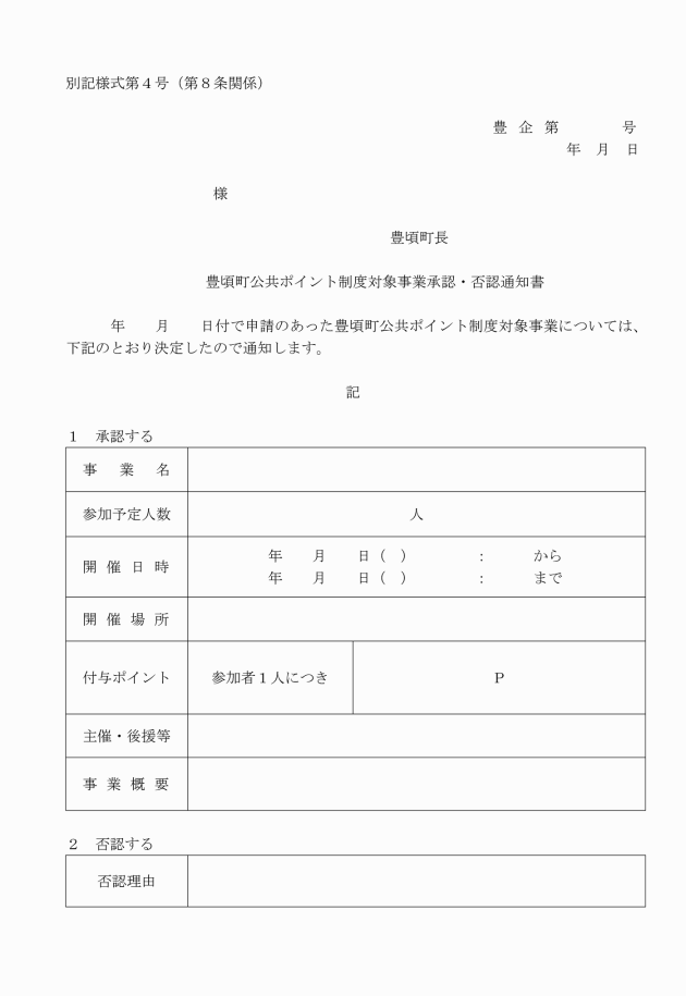 第3条 会員になろうとする者は、別記様式第1号豊頃町公共ポイント制度申込書(以下「申込書」という。)に必要事項を記載し、町長に提出するものとする。ただし、会員登録できる者は、申込日において小学生以上の者とする。