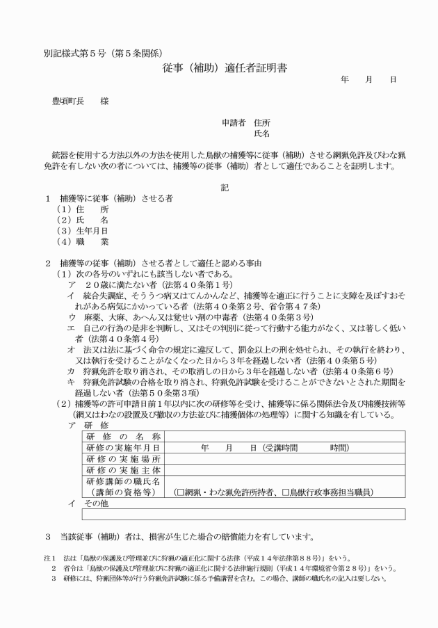 イ 申請者が法人で、その者が鳥獣の捕獲等に網猟免許及びわな猟免許を有しない者を従事させる場合は、「従事(補助)適任者証明書(別記様式第5号)」