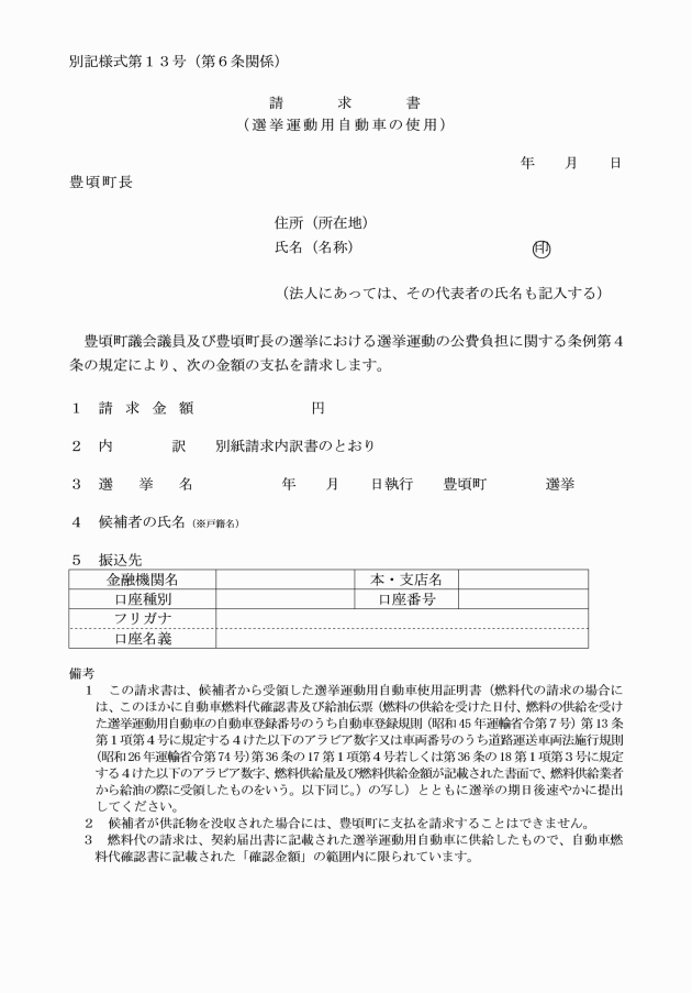 第1条 この告示は、豊頃町議会議員及び豊頃町長の選挙における選挙運動の公費負担に関する条例(令和3年条例第1号。以下「条例」という。)第12条の規定に基づき、条例の施行に関し必要な事項を定めるものとする。
